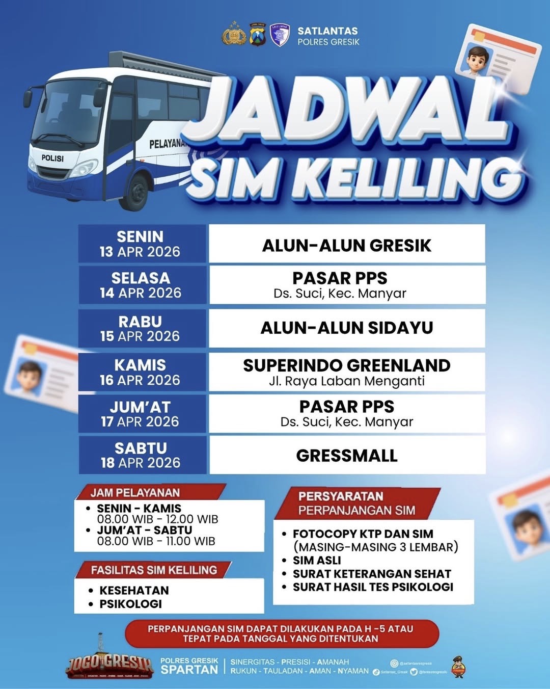 INFOGRESIK – Berikut jadwal pelayanan mobil SIM keliling Polres Gresik untuk pekan ini pada hari Senin-Sabtu atau tanggal 13-18 April 2026.