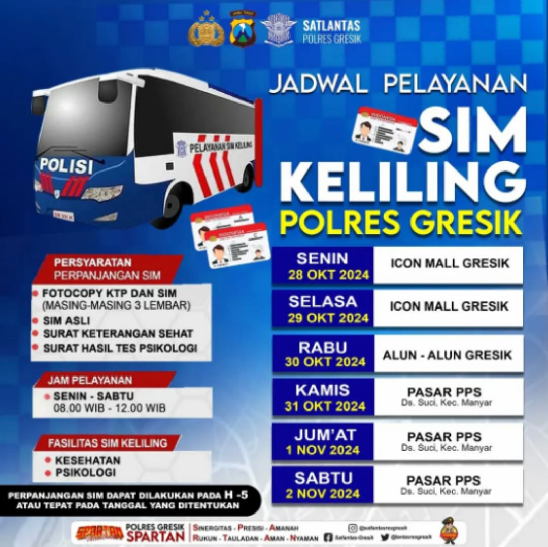 Hari Kamis tanggal 31 Oktober 2024 SIM keliling akan dilaksanakan di Pasar PPS Desa Suci Kecamatan Manyar Kabupaten Gresik.