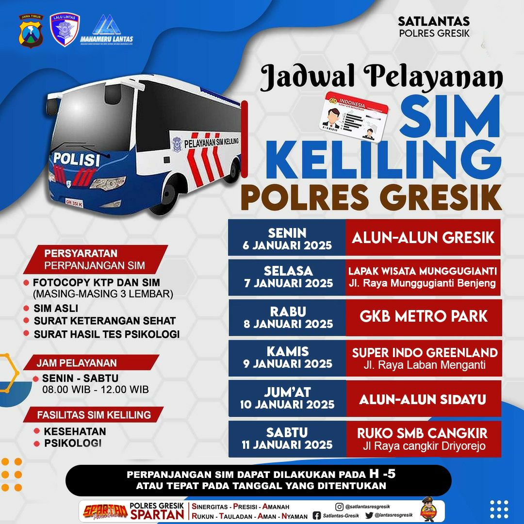 Hari Senin tanggal 6 Januari 2025 SIM keliling keliling akan dilaksanakan di Alun-alun Gresik.