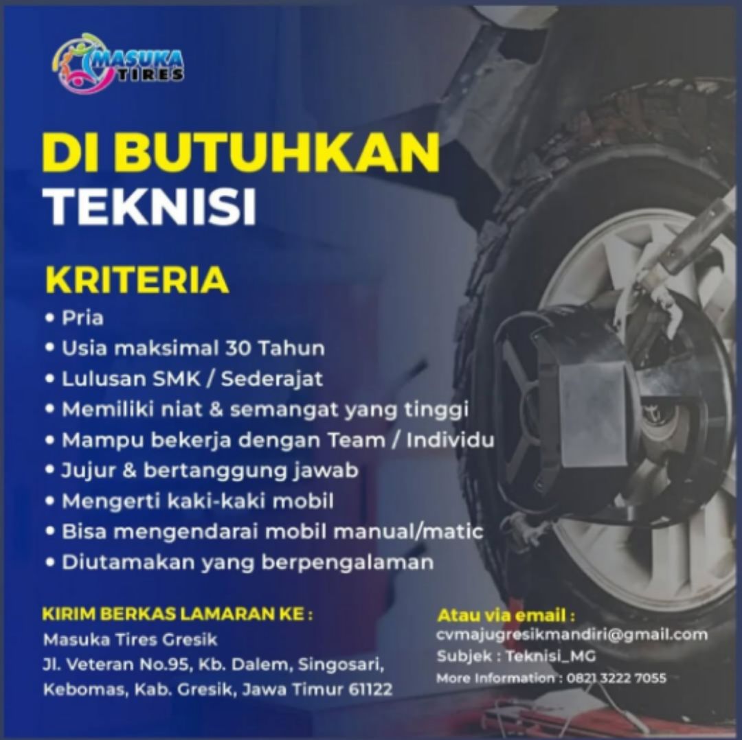 INFOGRESIK – Sebuah tempat usaha Masuka Tires Gresik di Jalan Veteran No.95 Kb. Dalem Kelurahan Singosari Kecamatan Kebomas Gresik membuka lowongan kerja (Loker) untuk teknisi mobil dengan syarat sebagai berikut: