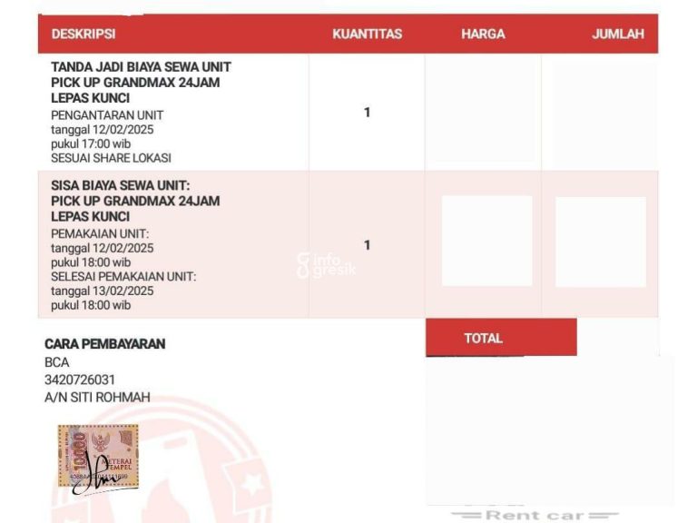 Karena sedang butuh, Azwinul kemudian menghubungi nomer telpon yang tertera. Sebagai tanda jadi sewa selama 24 jam, yakni dari hari Rabu (12/2/2025) pukul 18.00 WIB sampai Kamis (13/2/2025) pukul 18.00 WIB, dia diminta untuk mentransfer uang DP sebesar Rp 100.000,- ke rekening admin rental yang mengaku lokasinya di Perumahan PPS Desa Suci, Kecamatan Manyar.