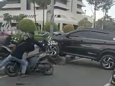Usai menabrak sepeda motor Vario warna hitam, mobil kemudian menabrak pembatas tengah jalan atau median, dan terhenti.