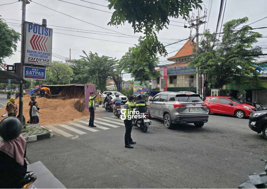 Arus lalu lintas sempat tersendat dan petugas Satlantas Polres Gresik mengalihkan kendaraan ke jalur berlawanan sebelum truk berhasil dievakuasi.